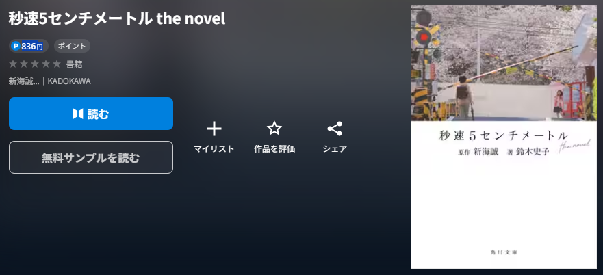 小説『秒速5センチメートル the novel』は、U-NEXTで836円で配信されています。