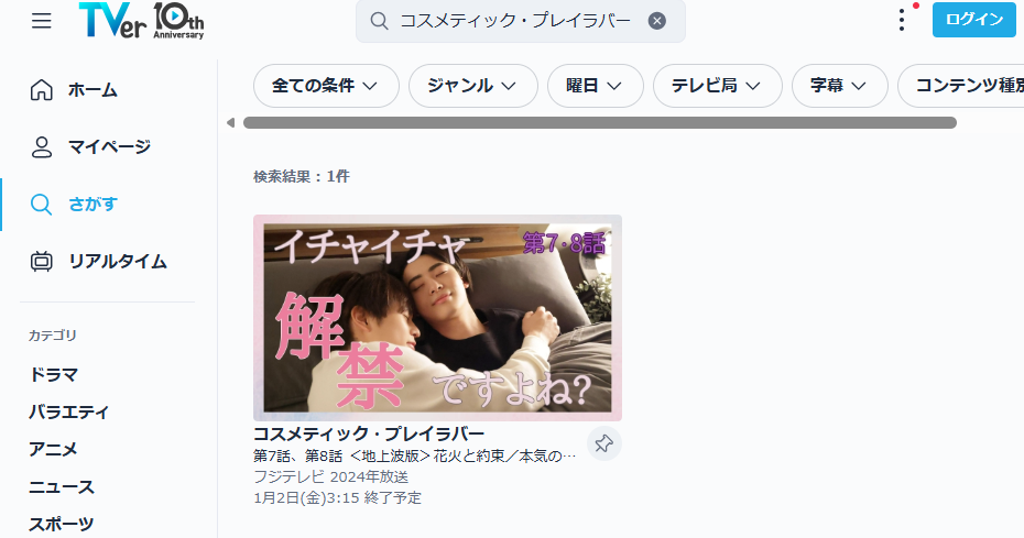 2025年12月現在、ドラマ『コスメティック・プレイラバー Season2』の見逃し配信動画が、TVerで無料配信予定です。