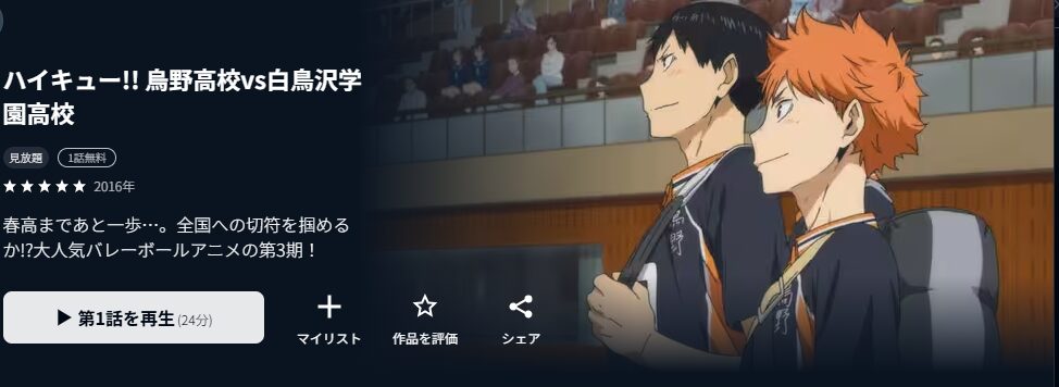 アニメ『ハイキュー!! 烏野高校 VS 白鳥沢学園高校 3期』の動画がどこで見れるのか、U-NEXTで配信されているか調べました。