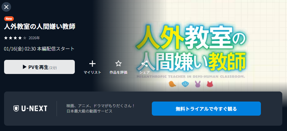 U-NEXTで配信予定のアニメ『人外教室の人間嫌い教師』の動画を全話見る方法