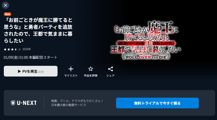 U-NEXTで配信中のアニメ『「お前ごときが魔王に勝てると思うな」と勇者パーティを追放されたので、王都で気ままに暮らしたい』の動画を全話見る方法