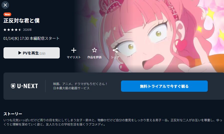 なので、アニメ『正反対な君と僕』の動画が見たい場合は、ぜひU-NEXTを利用してみてくださいね。